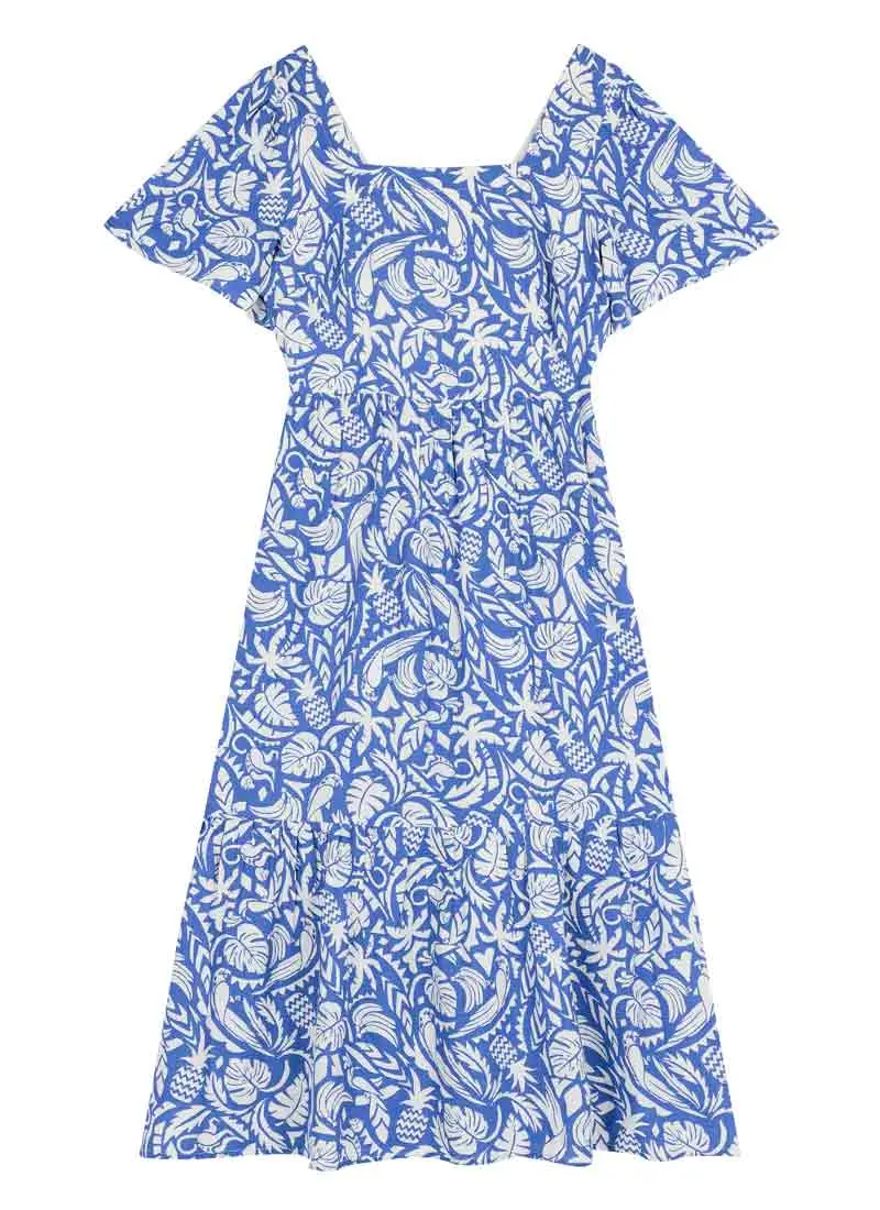 True blue! Georgia’s back in a tropical new print that’s perfect for breezy summer dressing. This vintage-inspired sundress is crafted from a soft and breathable linen blend fabric in an all-over tropical cut-out print on a bold blue background and features a square neckline, short, floaty sleeves, an elasticated back panel for added comfort, and a midi-length tiered skirt with pockets at the hip. Ivy is 5'11 and is wearing a UK size 10Sha is 5'7 and is wearing a UK size 16Regular fit - take your usual sizeUK Size 10 dress length: 120cmLinen blend fabricAll-over tropical cut-out printSquare necklineMidi-length skirtPocketsFor specific measurements of this garment, please see the Size Guide.